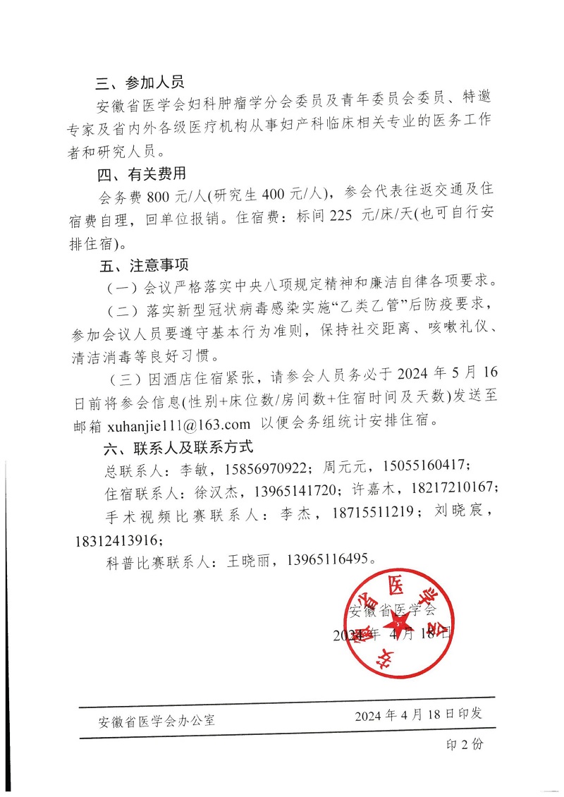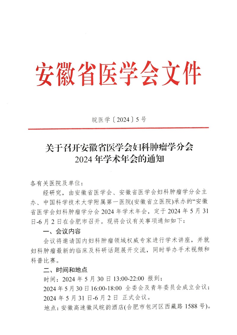 关于召开安徽省医学会妇科肿瘤学分会2024年学术年会的通知